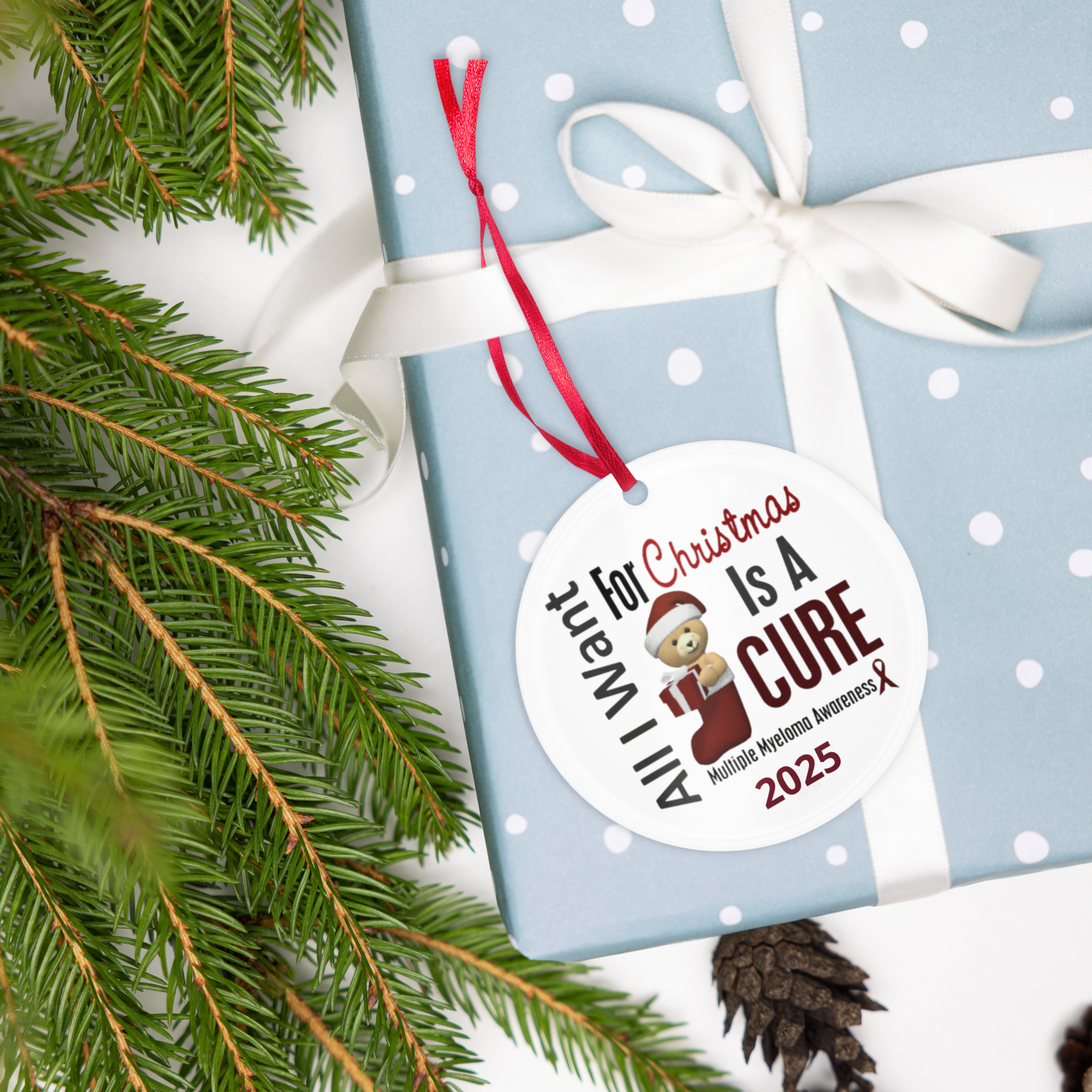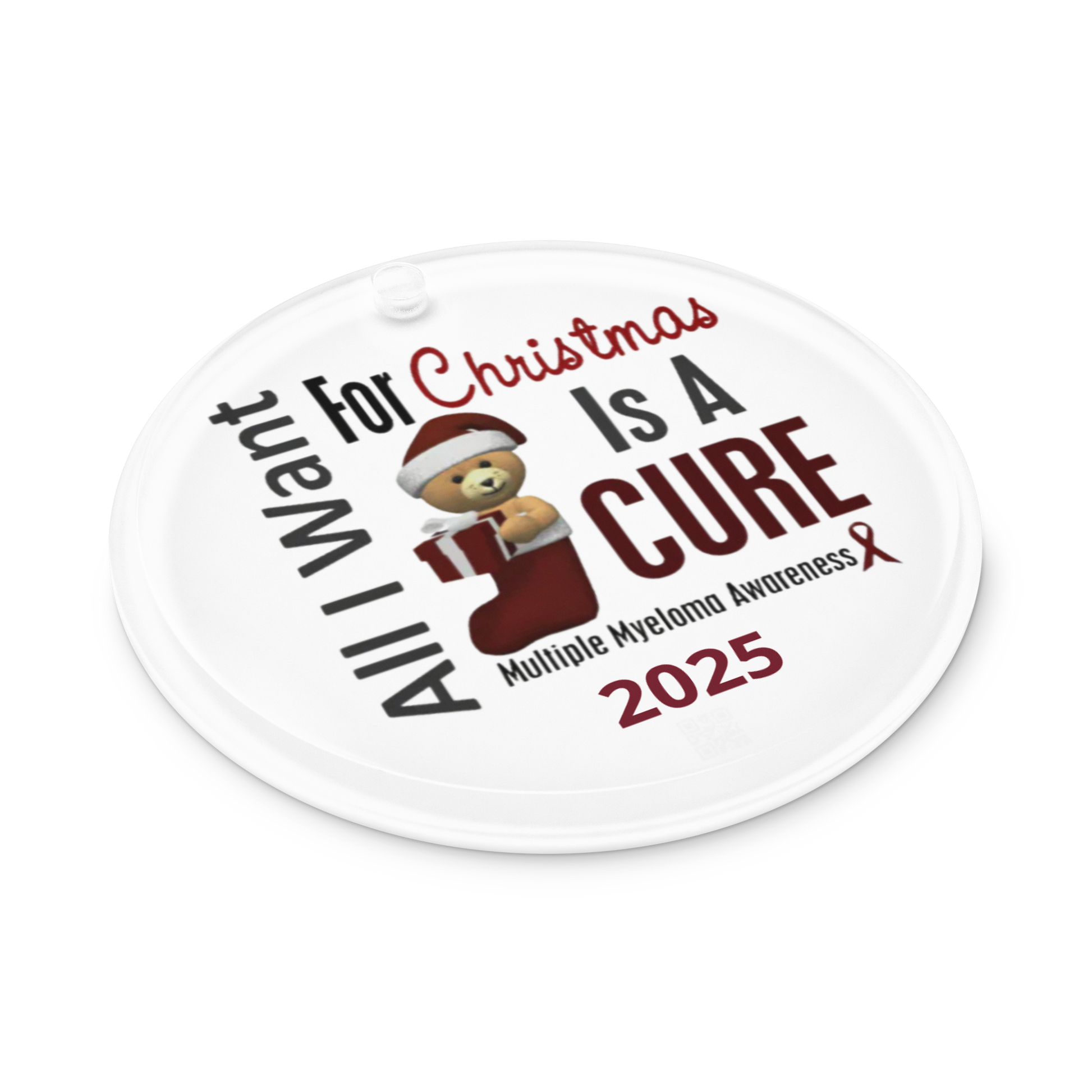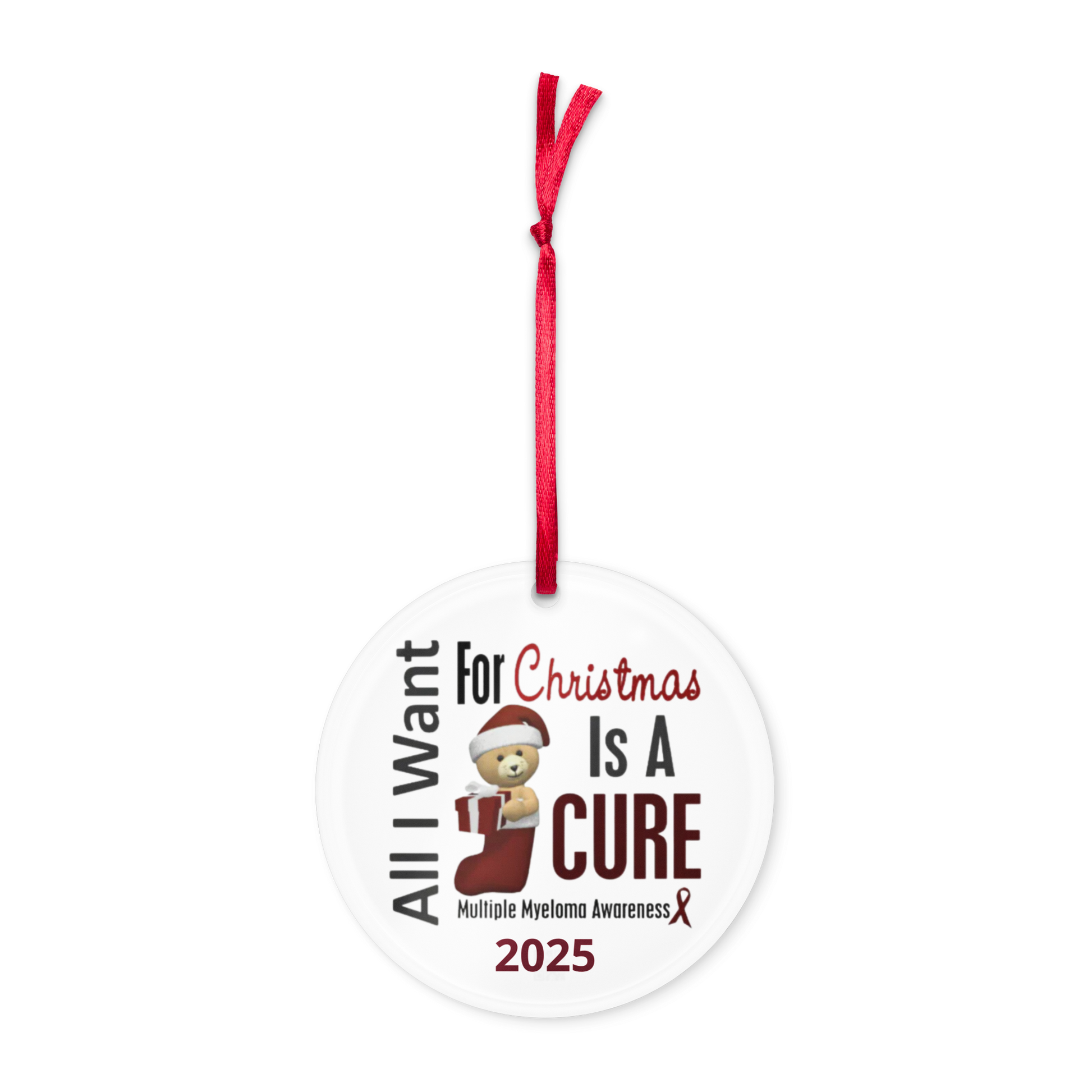 Introducing Myeloma For Life™ Ornament - a symbol of hope for a cure! Made from optically clear digital-grade acrylic, this 3" diameter ornament is the perfect addition to your holiday decorations. With a thickness of 0.25" it's lightweight and easy to hang with the included red ribbon. Show your support for Myeloma research with this beautiful ornament.