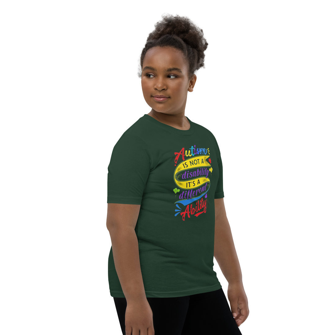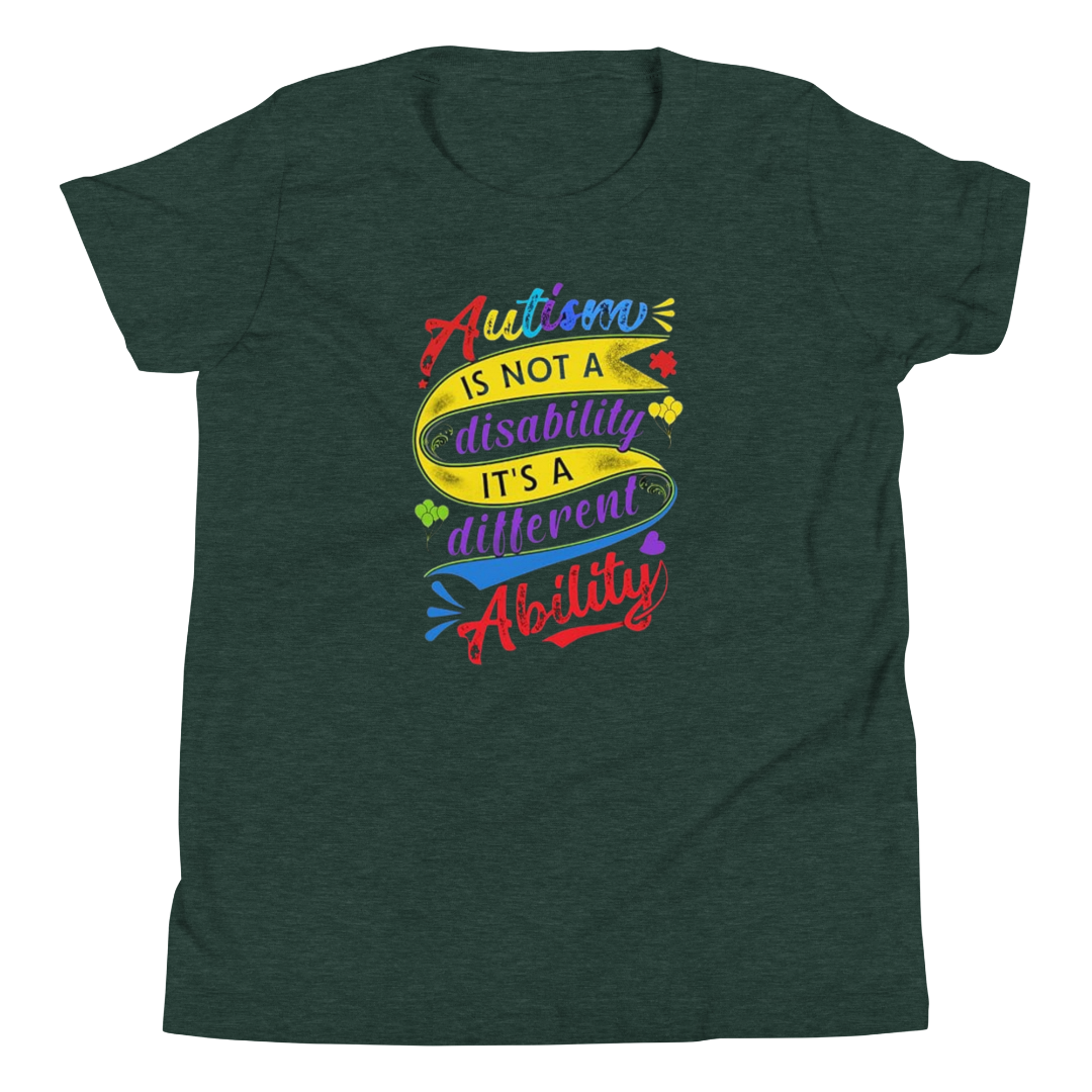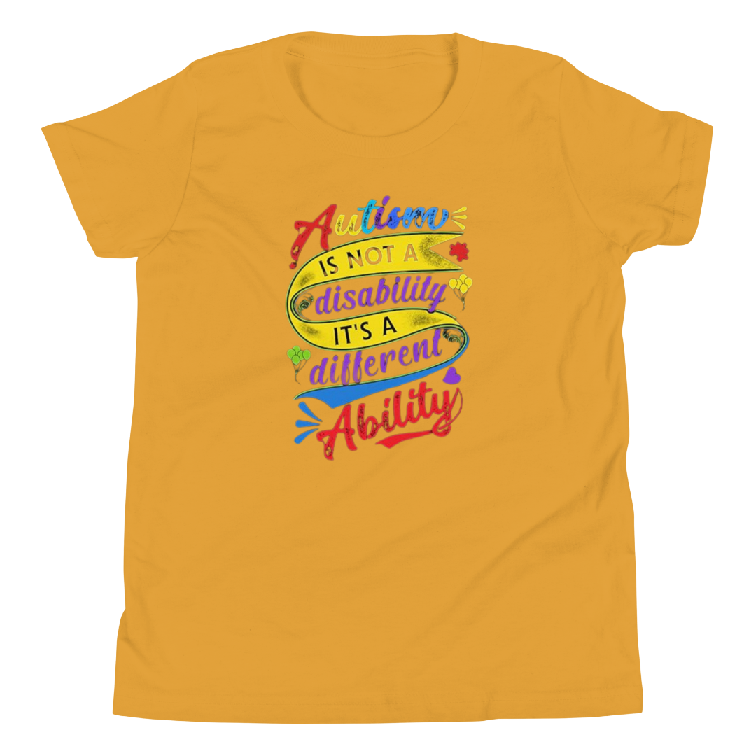 Elevate your child's wardrobe with our Autism is a Different Ability youth t-shirt! Made from 100% combed and ring-spun cotton, this t-shirt is not only soft and comfortable but also durable. The relaxed unisex fit ensures a cozy wear, while the pre-shrunk fabric maintains the shape wash after wash. Available in a variety of colors, this t-shirt is the perfect way to show support and raise awareness for autism in style.