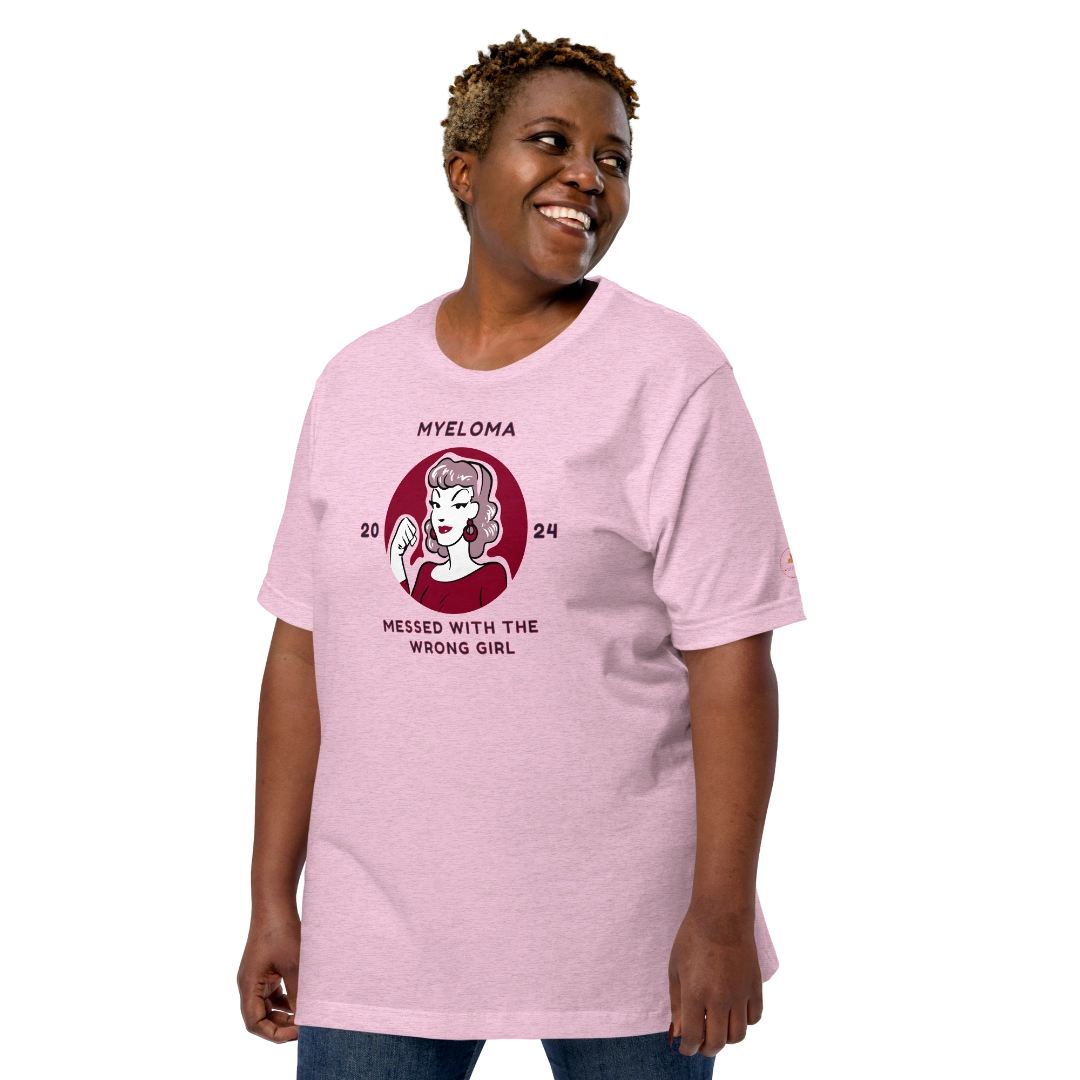 Stand up against myeloma with our bold printed tee! Let the world know that myeloma messed with the wrong girl. Made of 100% combed and ring-spun cotton, it guarantees comfort and quality. No need to worry about it shrinking after washes, as it’s pre-shrunk fabric. Available in a variety of shades, including Heather colors which contain polyester. Wear your resilience proudly with Shop Wrenée™!